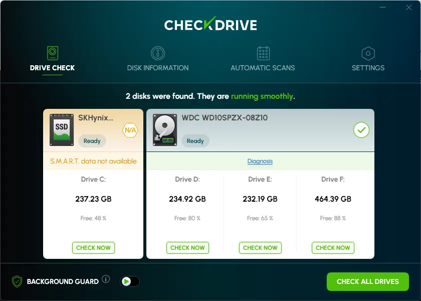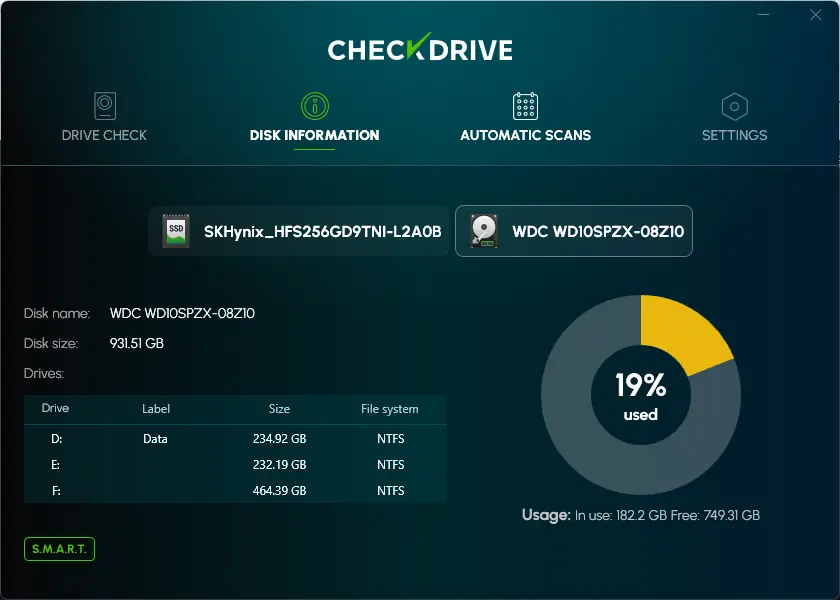 If you want to automate disk monitoring operations, fix disk failure issues, and perform regular checks on your internal drives, you need CheckDrive. With a short setup and attractive user interface, this tool can scan and monitor your computer’s hard drive in great detail.