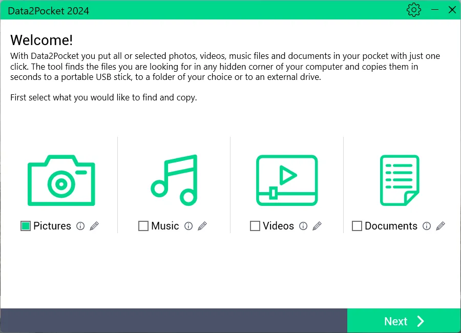 Abelssoft Data2Pocket 2024 Finds pictures, music, videos and documents on your Windows PC and copies them to a USB stick or USB hard drive in one go. This is useful when you want a straightforward, fast data backup.