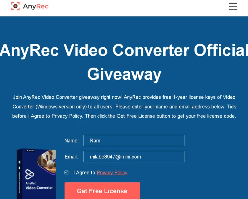To get a free license code, visit this giveaway page: https://www.anyrec.io/cooperation/video-converter/