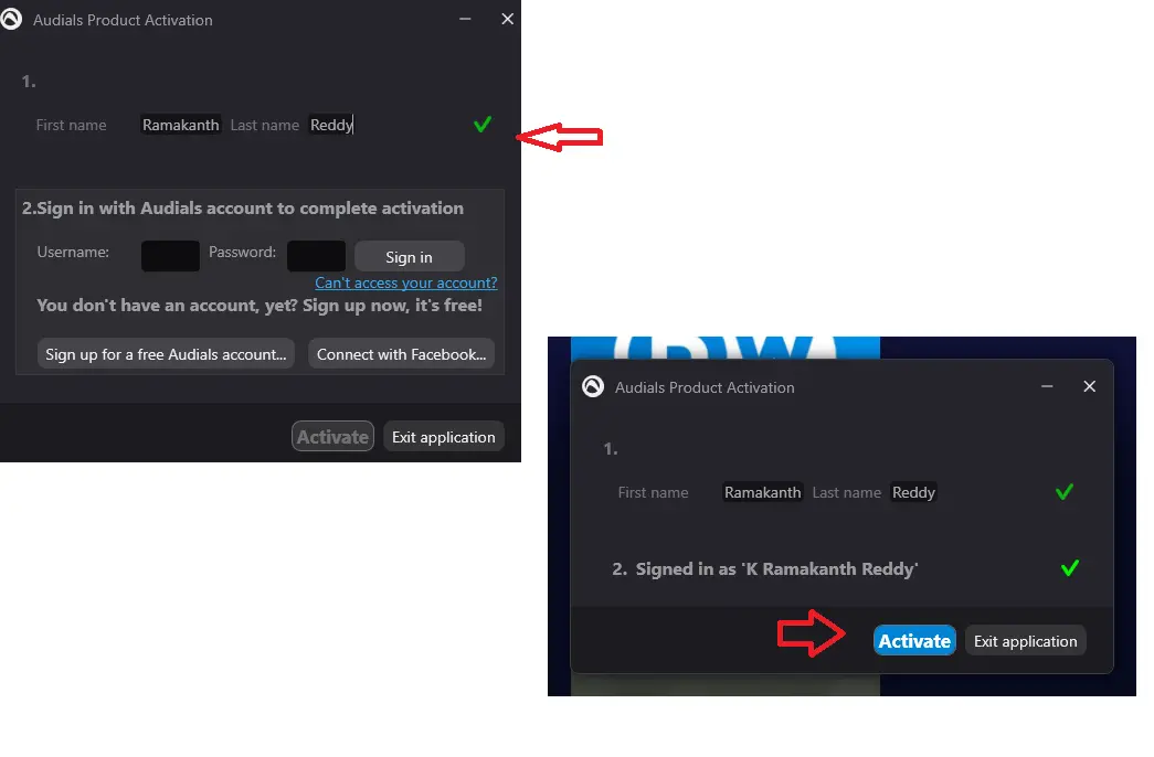 Enter your name to sign in with your Audials account, or create a new account. You can also sign in using your Facebook account.