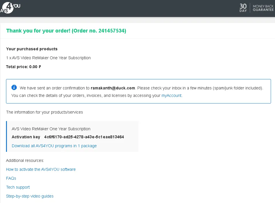 Please wait a few seconds; your order will be processed and the license code (copy it) and the link to download the software will be displayed on the page.