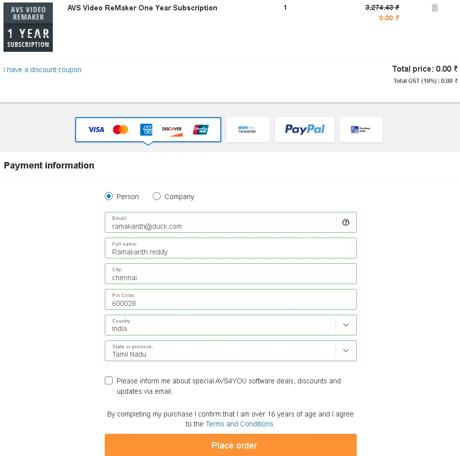 On that cart page, you can see that a coupon code has been applied and the price of the product (AVS Video Remaker 1-Year Subscription) has been reduced to zero.
