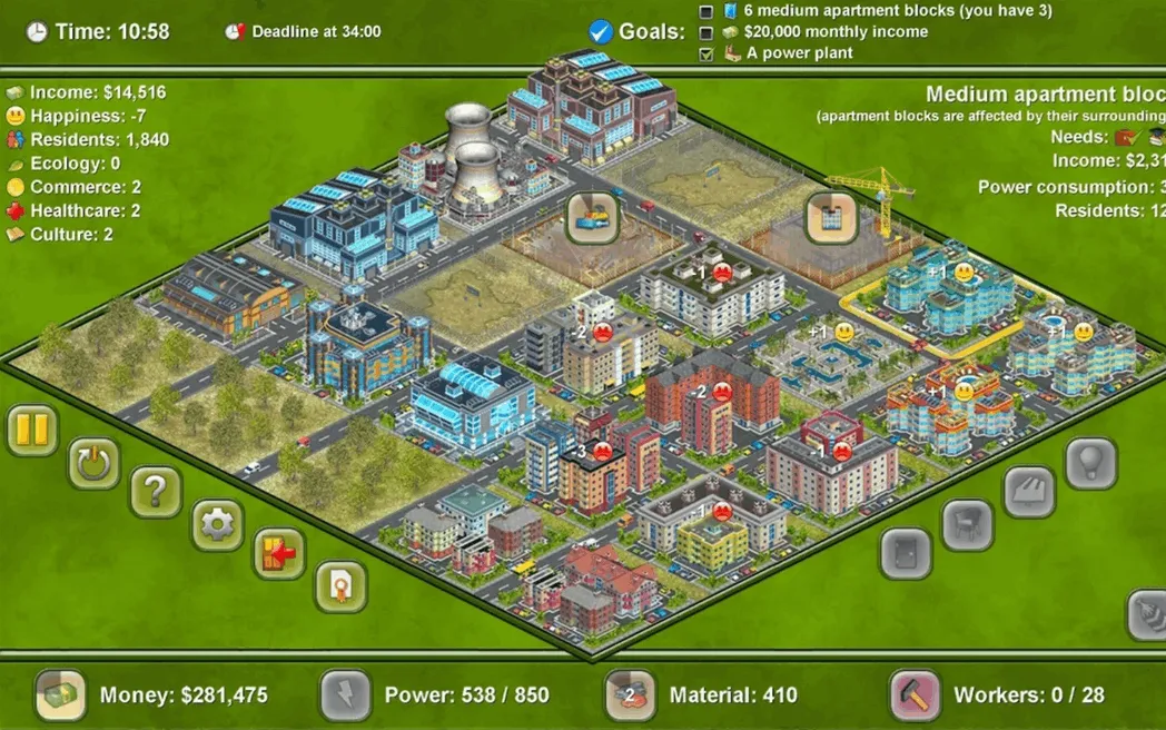 Build attractive and practical urban areas with lots of modern blocks; your citizens will be grateful for the services you provide, and in the end they will pay you well.