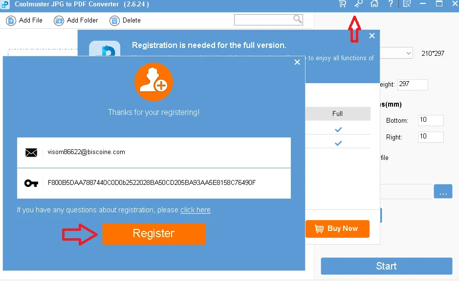 After installation, run the software. In the main window, click on the “Key” icon. Next, click on “Register” in the pop-up window.