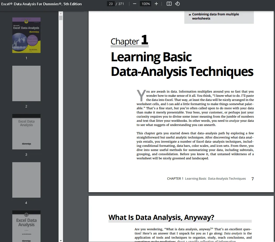 If you’re new to data analysis in Microsoft Excel, Excel Data Analysis for Dummies is a great place to start because it’s beginner-friendly and filled with simple examples and explanations. Among other things, you’ll learn how to create and view data visualizations, apply pivot tables, and use statistical functions to forecast outcomes and characterize correlations.