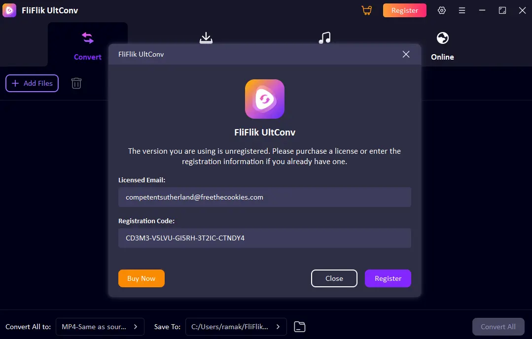 Install and launch the software. On the primary interface of the app, click on the “Register” button. In the pop-up window that appears, enter your email and the license code you received and then click “Register”.