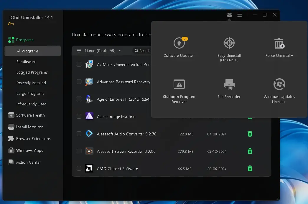 IObit Uninstaller 14 Pro offers various additional functions, including the ability to mass uninstall programs, force uninstall stubborn software, roll back Windows updates, and employ a file shredder. With all these functions, it is a complete tool for system maintenance.