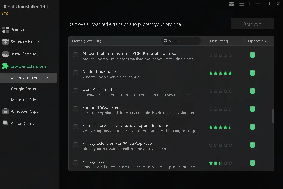 Uninstaller 14 simplifies management of extensions in multiple browsers, including Chrome, Firefox, Edge, IE, and Opera. This function enables users to detect outdated or potentially harmful extensions and uninstall them, ensuring a safe surfing experience.