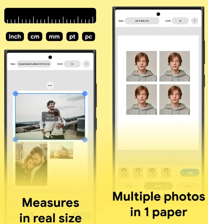 print photo (Print to Size) is an Android app that makes it easy to print photos. It lets users resize their photos to different sizes and print them from their smartphones. This includes passport and label sizes.