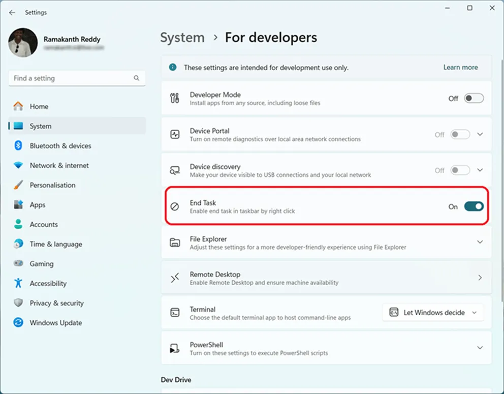 - Find the ‘End task’ option and activate the feature by toggling the switch next to it.