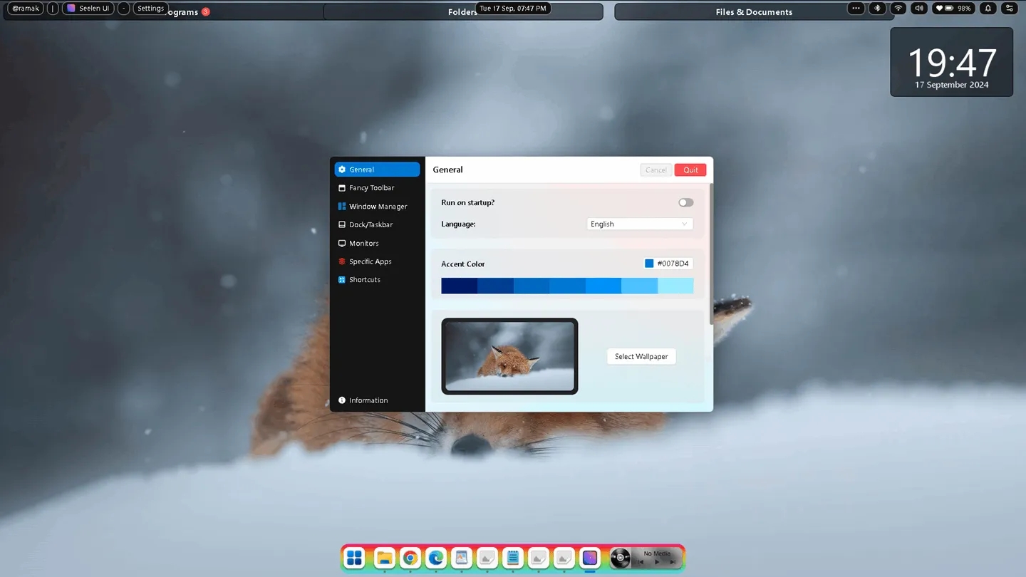The “General” tab contains basic configuration options. Among other things, you can change the desktop wallpaper, choose the language, Windows Accent color, and execute Seelen UI on startup.