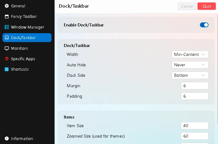 ,Dock/Taskbar” option allows you to customize the floating dock that Sealane UI brings to your desktop. You can adjust its size, visibility, position, and width.