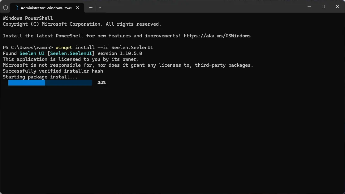 3. Using Winget: Use the following command in the Windows Command Prompt: The command “winget install –id Seelen.SeelenUI” allows you to install the Seelen utility.