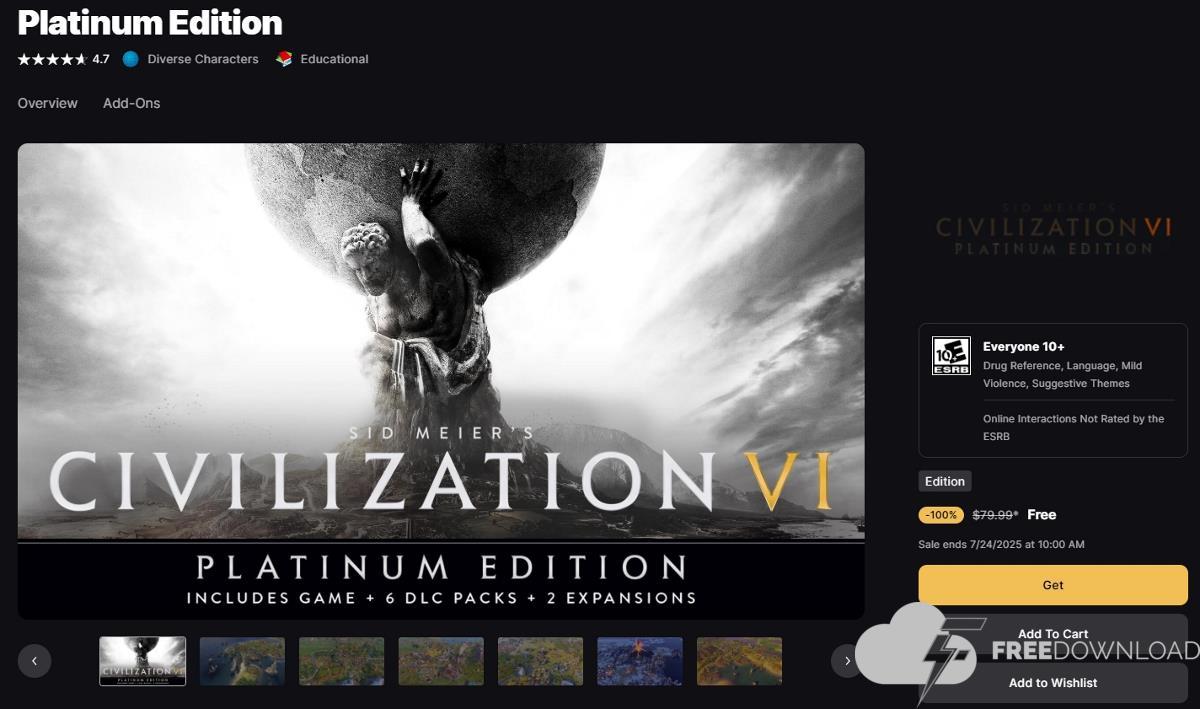 Sid Meier’s civilization VI: Get the platinum version for free from the EPIC Games Store. Walks cheap By 25 July (next Thursday), So make sure that you claim it before it ends.
