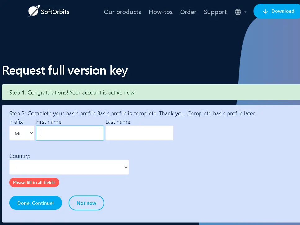 Fill out a short form with your first and last name, select your country and click the “Done/Continue” button. The page will then display the license code—copy it.