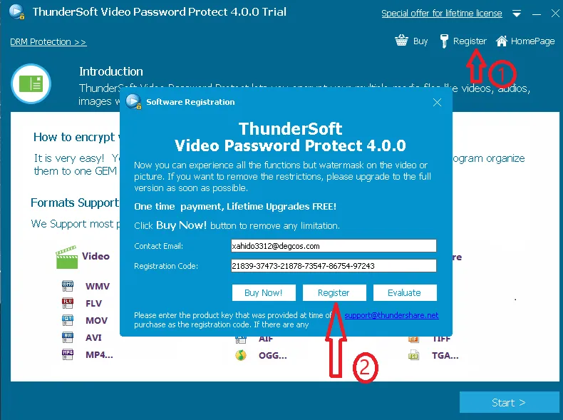 Please enter your email address and license code provided in the box below. Click the “Register” button to finish.