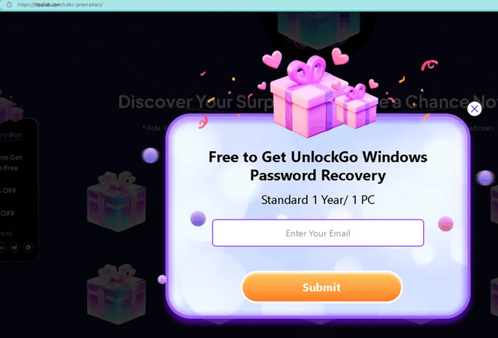To access the iToolab UnlockGo—Windows Password Recovery freebie, click on each box until you reach it. Once you receive the reward, the registration form will appear.