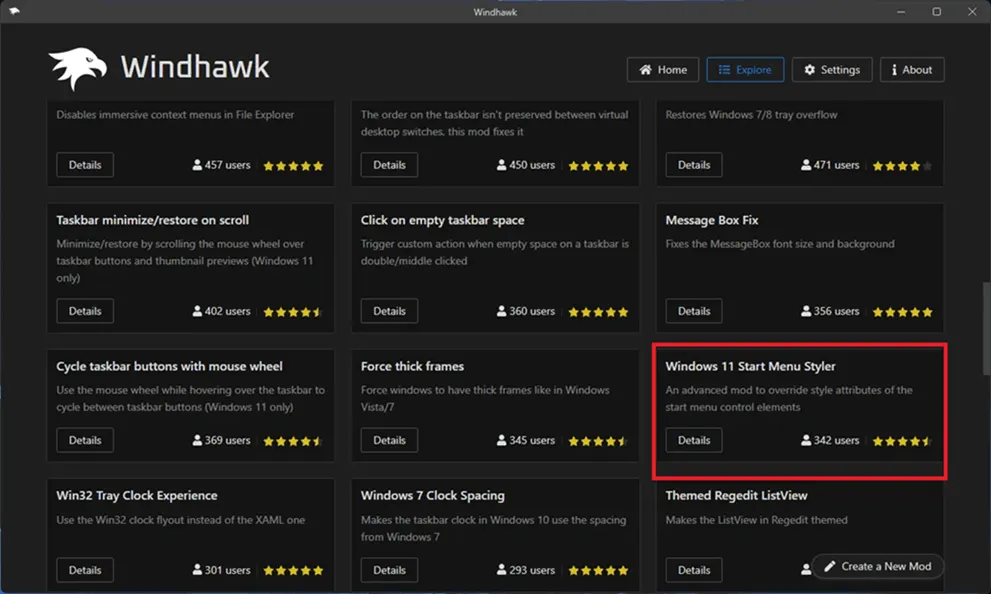 - Set up the Home windows 11 Begin Menu Styler mod:Begin Windhawk up and go to the “Discover Mods” menu. There you’ll be able to search for the “Home windows 11 Begin Menu Styler” mod. To get extra details about the mod and to put in it, click on the “Particulars” button.