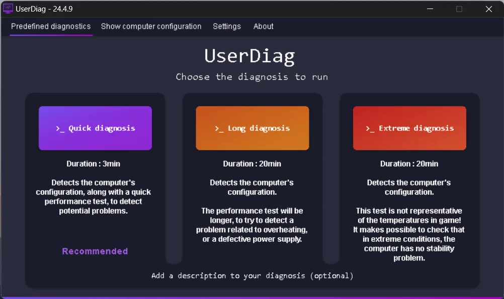 A straightforward-to-navigate tabbed interface is what you’ll see whenever you begin UserDiag. “Predefined diagnostics,” “View laptop configuration,” “Settings,” and “About” are some tabs that make up this interface.